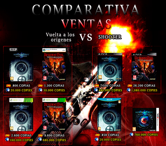 Desde aquí le otorgamos la palabra "fracaso" en el intento de crear un punto de restauración por parte de CAPCOM en la saga Resident Evil, porque como se aprecia en el siguiente gráfico las ventas de Revelations han sido muy inferiores al título Resident Evil Operation Raccoon City, un juego muy malo en cuestiones de jugabilidad y calidad de producto para lo que viene a ser un título de ésta saga de videojuegos.