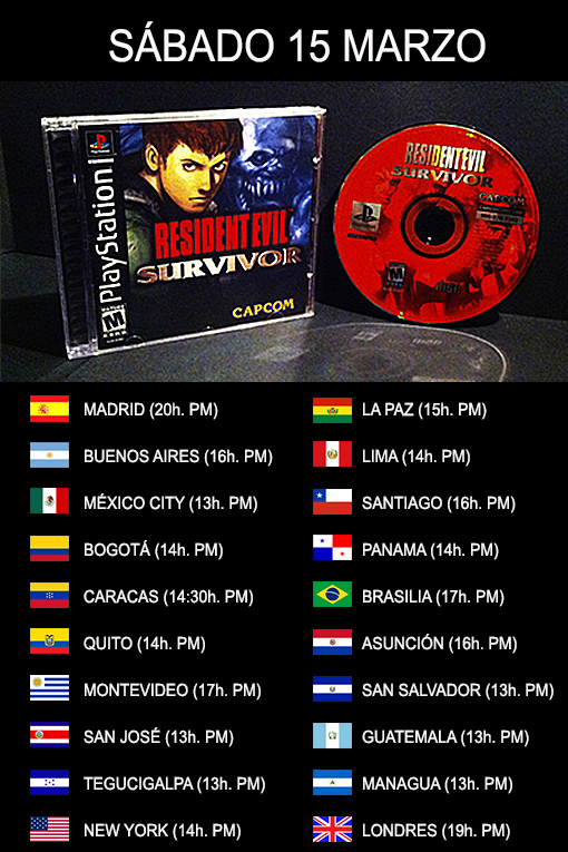 Queremos anunciar que el quinto streaming se realizará el próximo Sábado 15 de Marzo, los horarios se pueden encontrar más abajo. Esta vez dedicaremos un pequeño directo a Resident Evil Survivor (BIOHAZARD Gun Survivor) y la aventura de Ark Thompson en la Isla Sheena. Con la participación al mando de juego de Chris_Chocobo, más los comentarios en vivo de Michael Chandler (Webmaster de reCenter), y varios invitados aún por confirmar (Estás invitado a participar: streaming@residentevilcenter.net).