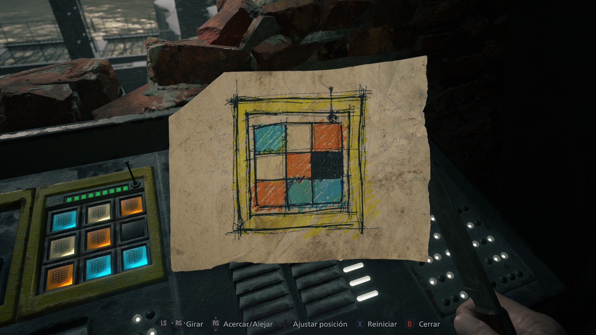 Observa la antena del panel y verás que está situada en la esquina superior derecha. Utiliza esto como referencia para girar el dibujo, hasta que la posición de la antena coincida con la del panel. Ahora solo queda replicar el patrón de colores del dibujo y podrás bajar la palanca para abrir la esclusa.