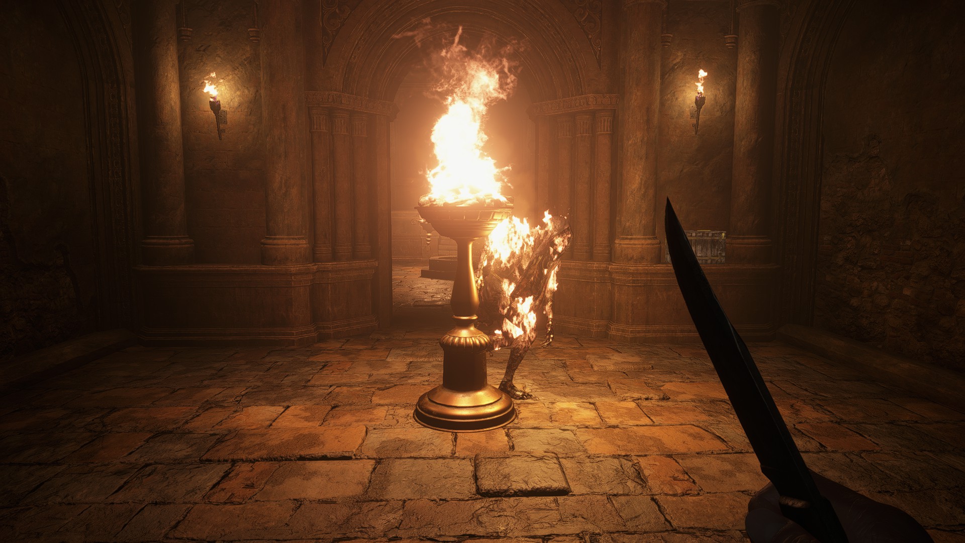 3. Atrae al enemigo hacia el fondo de la sala principal y haz que se pegue a la antorcha para que la encienda con sus llamas.