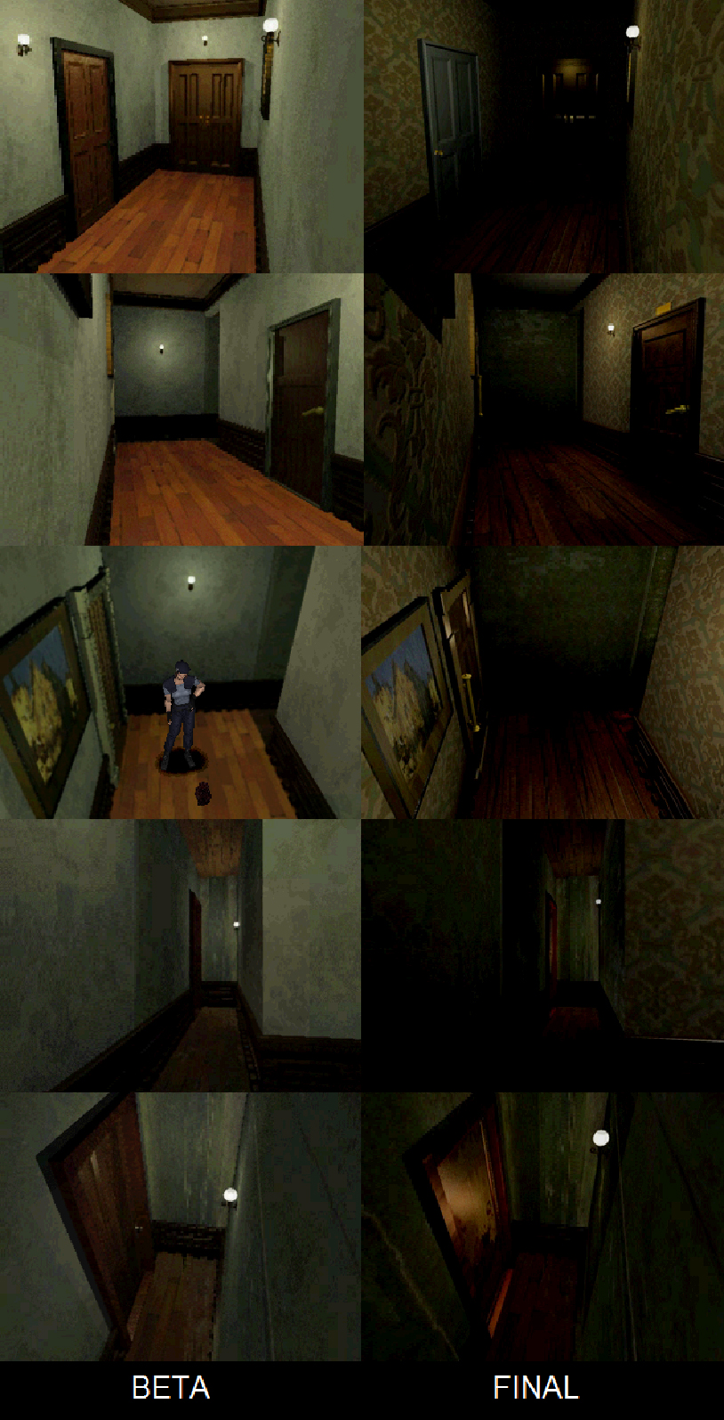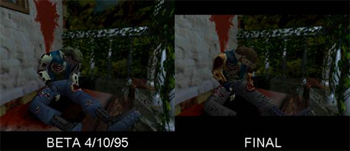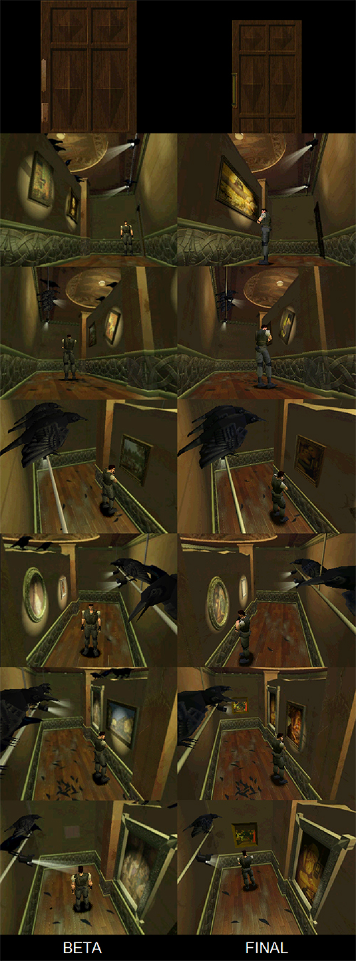 Por suerte para la versión final, todos los modelos de personajes y objetos tridimensionales mejoraron bastante y estaban a una calidad muy buena para un juego de aquella época. Otras diferencias que hay, aunque mínimas, en la beta es que al entrar en la sala, durante la animación de la puerta, se escucha el terrorífico sonido de cuando examinas el cadáver de Forest en la versión final. Los cuervos vuelan por la zona en círculos pero parece ser que no atacan a no ser que se les ataque y se puede examinar el cadáver de nuestro compañero tantas veces como quieras.