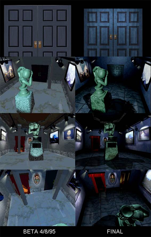 La siguiente sala es una de las que probablemente haya sufrido cambios más notables durante su desarrollo, hablamos de la sala de arte azul. Como se puede observar, ya hasta el modelo de la puerta al entrar en ella es diferente, esta sala se ha mostrado en varios videos de la época durante la presentación del juego y es importante por varios hechos tanto en la beta como en la versión final. En la versión final aquí es donde conseguíamos el mapa de la primera planta de la mansión empujando unas escaleras pequeñas inexistentes en las betas y había un mueble que al empujarlo, nos dejaba acceso a una sala pequeña de la que hablaremos a continuación. En la beta como se puede observar en las fotos, la iluminación, algunos cuadros, el tono azul de la sala o incluso algunos ángulos de cámara eran totalmente diferentes a la versión final.