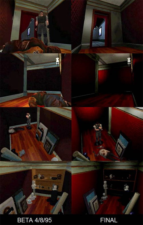 Las tres próximas salas que aparecen en la foto tampoco presentan cambios en su diseño entre las versiones beta y la final. El pasillo en forma de L, en las betas, tiene como enemigo una araña gigante y no hay objetos ni munición debajo de los muebles. En la versión final no aparece una araña sino dos y eso ocurre cuando volvemos a la mansión de nuevo tras visitar la casa de invitados. La primera vez que pasamos por ese pasillo nos asaltan dos Cerberus por la ventana, hecho que asustó a más de uno en sus primeras partidas. Un detalle que hemos podido observar es que la araña en la beta escupe un acido verde y en la versión final es transparente. Su sangre en la beta es de un verde mas claro que en la versión final.