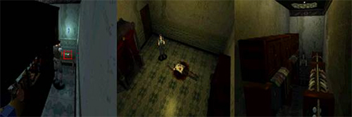 La siguiente sala pese a ser un dormitorio pequeño y desordenado es una habitación bastante recordada por los fans por el famoso diario del guarda y por el susto que nos dá un zombi al salir del armario que hay justo detrás al tocar dicho diario. Es una de las tres salas accesibles con el truco anterior y como se puede apreciar en la foto de arriba hay bastantes diferencias. La mas notable son los ángulos de cámara. Otra diferencia también muy evidente es el cambio en la decoración, la cama no esta en la misma posición que en la versión final y el armario también es distinto, también porque le faltan las puertas. Los muebles de la entrada y la puerta también son algo diferentes a la versión final.