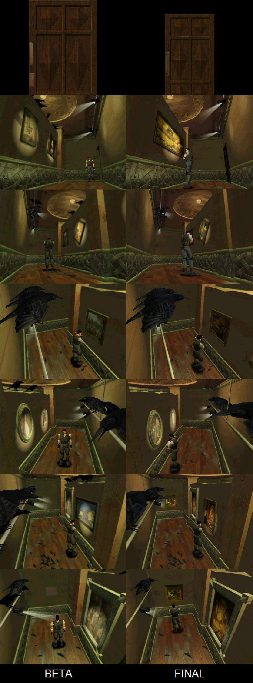La segunda diferencia clara es que algunos de los cuervos en la beta son falsos y solo sirven de decoración. Uno de los cambios que apenas se nota es la iluminación de la sala, fijaos bien en las fotos y veréis que el tono es algo distinto, pero hay que fijarse bien. Otra diferencia antes de pasar a la siguiente sala es la puerta, supongo que os fijareis cuando entréis a la sala, sino mirando las imágenes puede verse que son diferentes en el pomo y el zoom típico de las puertas presente en estas betas.