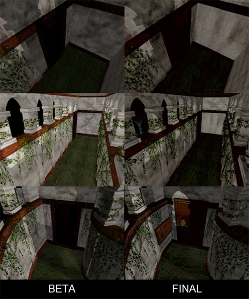 El siguiente pasillo no presenta cambios físicos en su diseño entre las versiones, pero sin embargo hay unos cuantos cambios pequeños que vamos a comentar a modo como si estuviésemos jugando al juego. Nada mas entrar en la sala ya podemos observar un cambio. En la primera beta el personaje aparece un poco desplazado hacia la derecha de la puerta en vez de centrado y como podemos observar en las fotos el modelo del personaje ha ido mejorando en cada fase de desarrollo hasta alcanzar una calidad impecable.