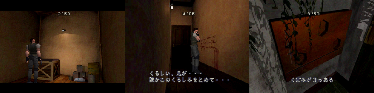 Esta versión salió hace muchos años y esta disponible para descargar en la web oficial de biohazard1. Antaño era conocida como la Beta 3 y a pesar de que solo dura 15 minutos aun tiene bastantes cosas curiosas. Para empezar esta demo conserva aún algunos ángulos de cámara de las versiones beta y los enemigos mueren de pocos disparos como en dichas versiones. Algunos objetos clave están cambiados de sitio como el escudo de madera, que se encuentra a lo alto de la estatua que hay en la sala azul de arte y otros objetos que están localizados de la misma forma que la beta que mencionábamos antes. Los cargadores no son acumulativos y cada vez que cogemos uno ocupan otro hueco más, algo que corrigieron después para la versión final. Tampoco nos permiten jugar con Jill ni acceder a algunas salas, esto solo es posible usando códigos. No podemos guardar partida ni tampoco salir al jardín. En la escena que mostramos en la primera captura, Chris escucha unos pasos de un zombi bajando por la escalera que hay encima de esa sala de guardar que en la versión final es el zombi con bata que hay fuera de esa sala bajo las escaleras. Los baúles tienen un aspecto diferente a la versión final y al abrirlos suenan como si fuesen de madera. Justo en la planta de arriba en esa misma zona hay un inquietante mensaje escrito con sangre, que al español se traduce como ‘’Mi garganta…No puedo soportar mas este dolor’’ mostrado en la segunda imagen, posiblemente sea el detalle mas llamativo de esta demo. En el pasillo de acceso al cobertizo que da al Jardín, como podéis observar en la última foto, solo son necesarios tres balsones para poder salir, aunque como hemos dicho no nos permiten salir al Jardín, en la versión final piden 4. Otra curiosidad de ese pasillo es que para poder entrar en él es necesaria la llave armadura y en la versión final esto no ocurre. Al terminar el tiempo de la demo sale un mensaje de ‘’To be Continued…’’ que salía en las betas anteriores que hemos revisado en este reportaje.