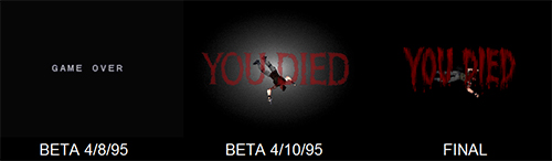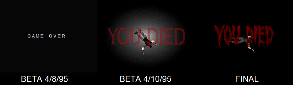 Ya hemos llegado al final de este tour por las betas del primer Resident Evil y que mejor forma de despedirse que con una imagen comparativa de las pantallas de muerte de las dos betas que hemos revisado aquí y de la versión final que todos hemos jugado y visto mas de una vez durante nuestra niñez?. En la beta de agosto no estaba implementada la escena de muerte por eso pone un simple mensaje de Game Over y entre la versión de Octubre y final se cambiaron las fuentes de la palabra ‘’You Died’’ como se puede ver en las imágenes. Esperamos que os haya gustado este reportaje y por si aun queréis ver más sobre estas betas, en la web de biohazard1.com hay un tráiler del juego con escenas de las betas y una presentación del Gameshow de 1995. También os animamos a visitar nuestra web Resident Evil Center para ver más material como este hecho por fans de la saga y dejar vuestras opiniones.