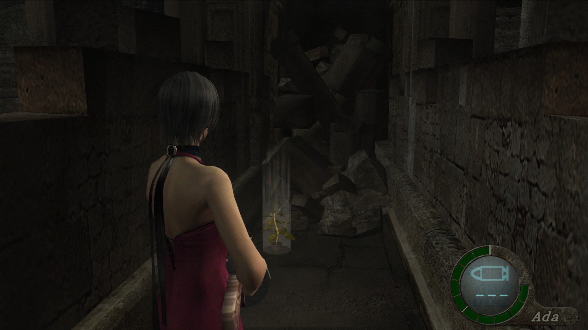 En la zona del helicóptero accidentado, hay una entrada a las ruinas que ha sido bloqueada por un derrumbamiento. La hierba amarilla se encuentra junto a las piedras que bloquean dicha entrada.